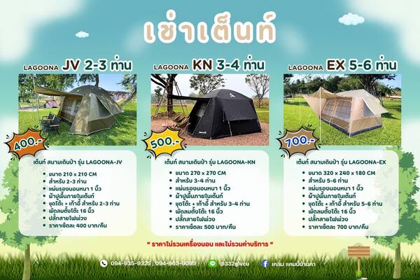 บริการเช่าอุปกรณ์: สำหรับใครที่ยังไม่มีอุปกรณ์ครบ ที่นี่มีบริการให้เช่าเต็นท์ และที่เด็ดสุดๆ คือมี แอร์เคลื่อนที่ ให้เช่าด้วยครับในราคาไม่แพง ทำให้สามารถนอนในเต็นท์ได้อย่างสบายๆ แม้ในวันที่อากาศร้อน
